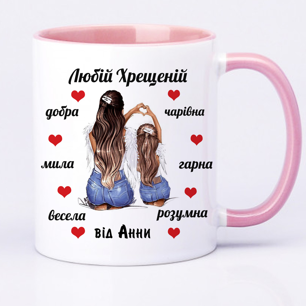 Чашки с оригинальным принтом, печать макета "Любій хрещеній (від дівчаток)". Ім'я хрещеної та дитини можна змінити. Друкуйте принти будь-якої складності, логотипи, фото, написи на білих чашках.