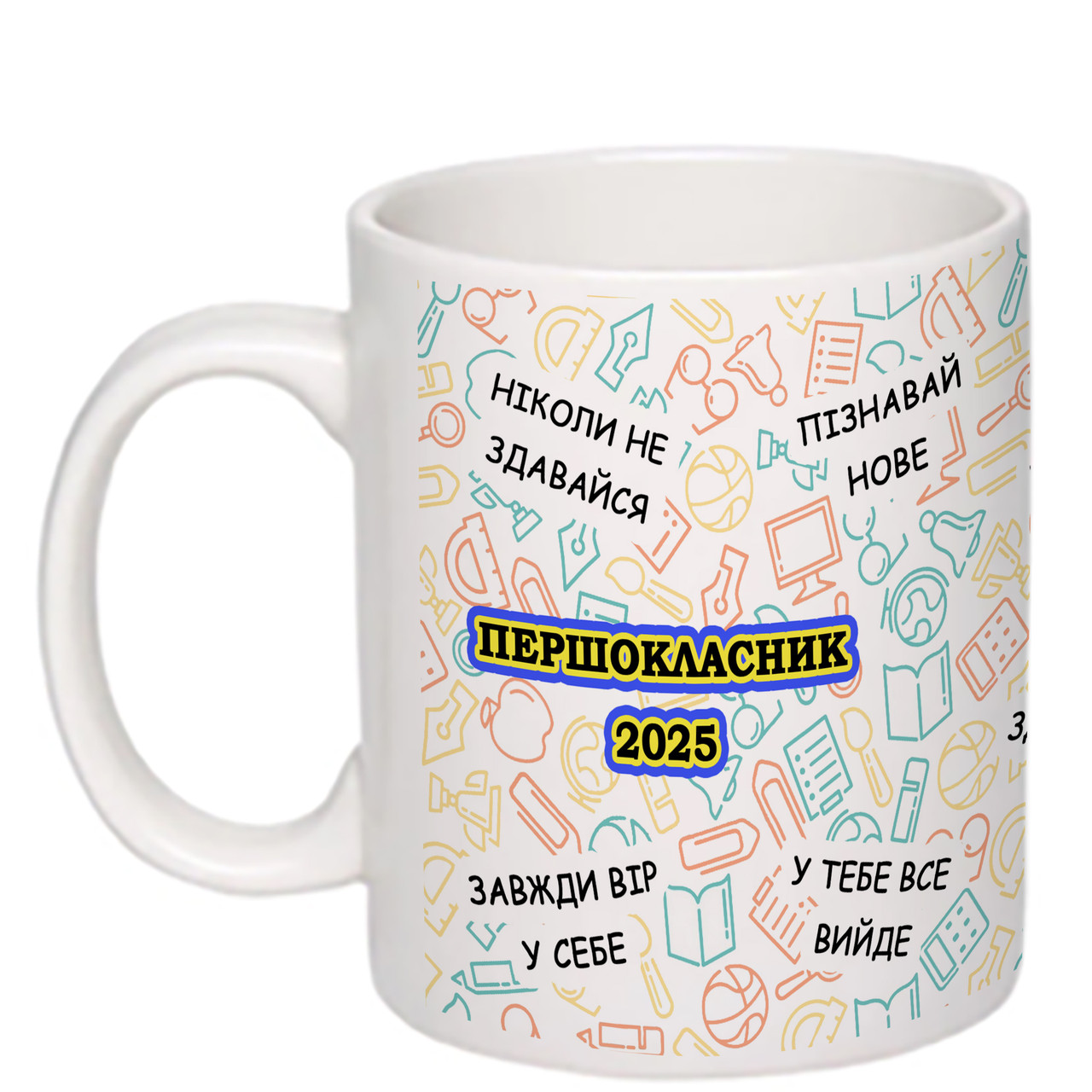 Чашка з друком "Першокласник". Колір, мова, напис, зображення можуть бути змінені за бажанням замовника (ціну уточнюйте у менеджера).